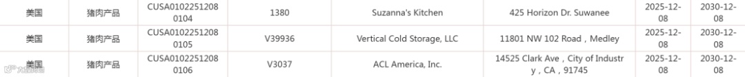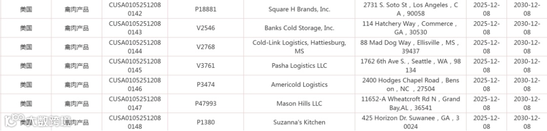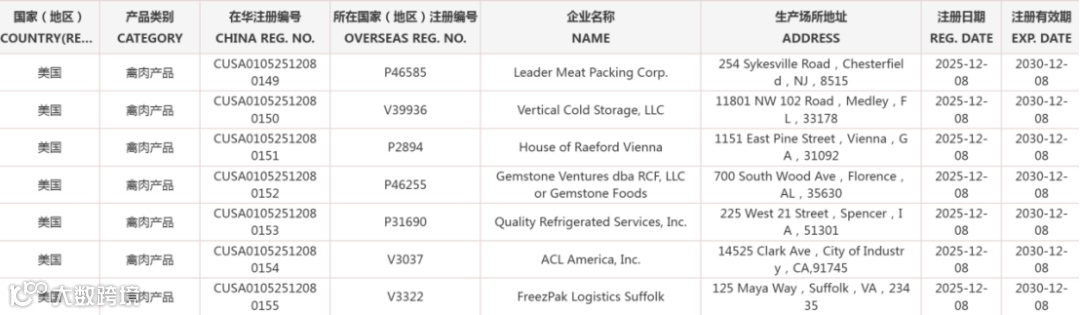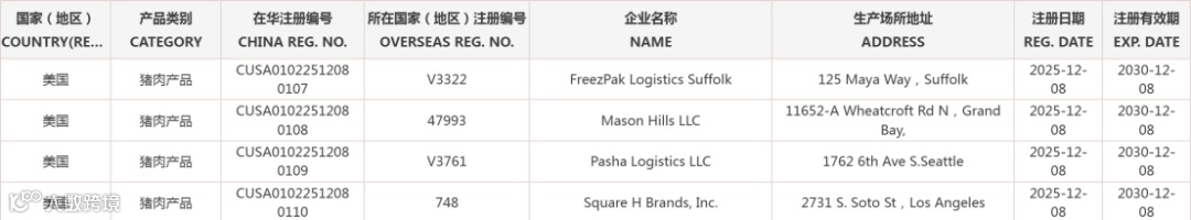 此次注册编码暗藏行业亮点:其中V3761、V39936 3037 47993 4 家企业同时具备猪、禽肉双出口资质,生产能力更全面。 这些企业需通过 “双重审核”:先经美国主管当局批准监管,其所在国食品安全体系还得通过中国海关等效性评估;再经中国海关书面、视频或现场核查,全部达标后才获 5 年有效期注册编号。