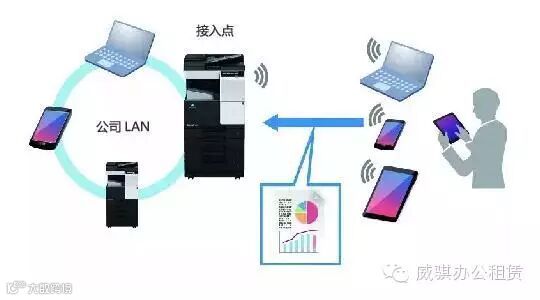 支持无线LAN AP(接入点)的模式,可与移动设备直接连接。由于这种连接与现有的公司网络分离,所以个人移动设备可直接连接至设备。