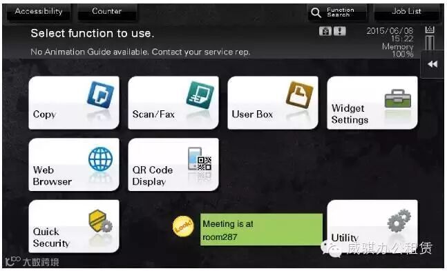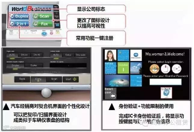 用户可自定义操作面板,将文本框、图标或GIF动画显示在操作面板上,用于显示复合机的操作注意事项、办公室通讯等信息。