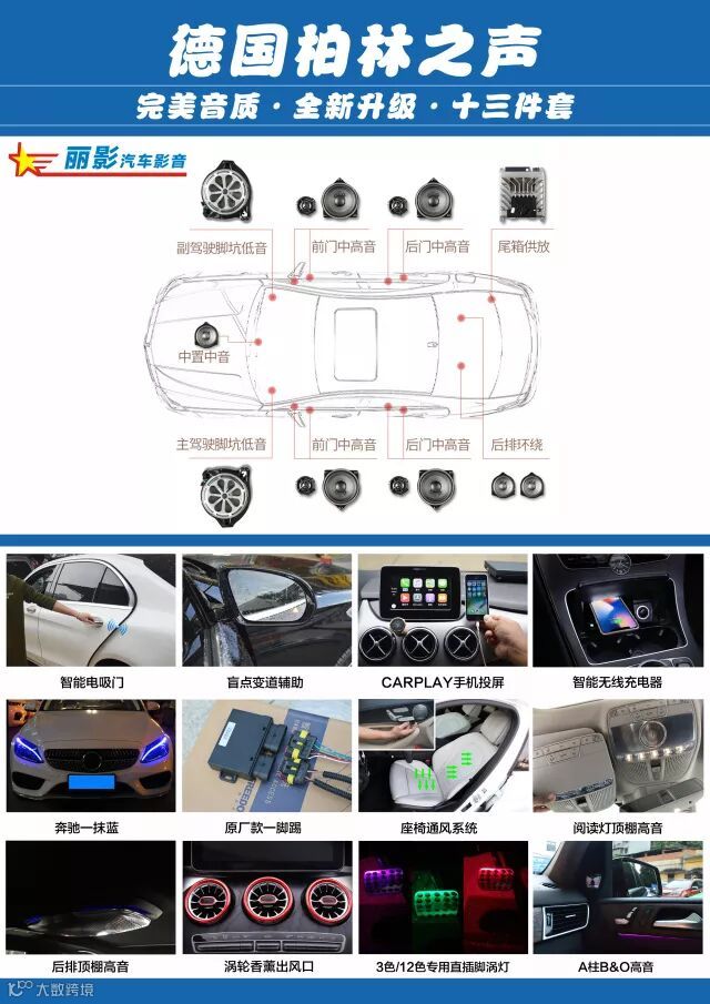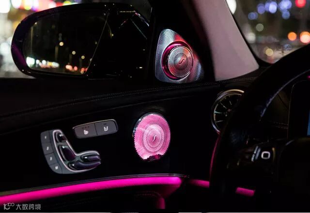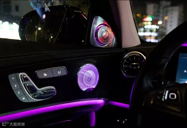 按照原车柏林中音盖板一比一打造,可同步原车3色/12色/64色环境氛围灯系统。中音氛围灯的唯美设计给车上增添了一份奢华的色彩。