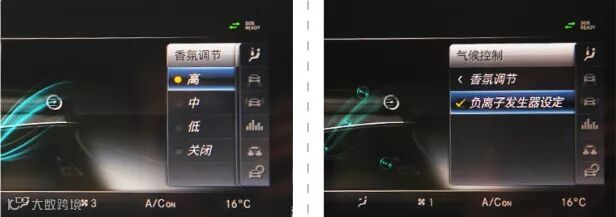 香薰系统由中控台控制,香味可以随空调出风散发到车内,四款味道“都市风情”“绚烂之夜”“自在心镜”“运动激情”香水供您选择,负离子发生器以及香薰喷雾发生器于车内空气调节组件,自动净化车内空气,有效过滤PM2.5及空气中的粉尘、异味、细菌等有害物质,给你优异的车内空气质量。