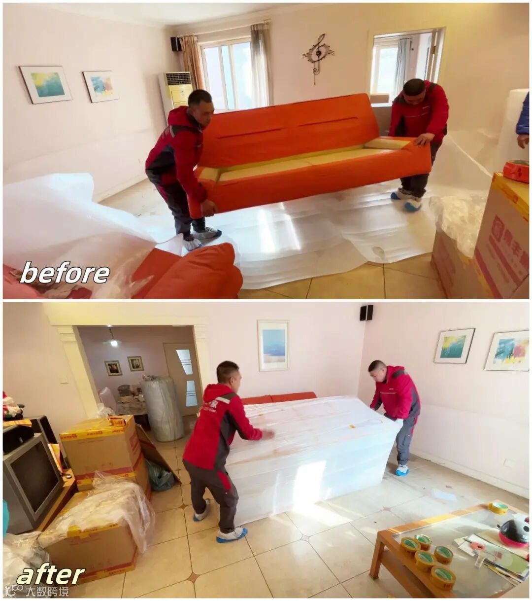客厅的沙发也是先拆解再使用气泡膜、胶带、缠绕膜进行细致防护;