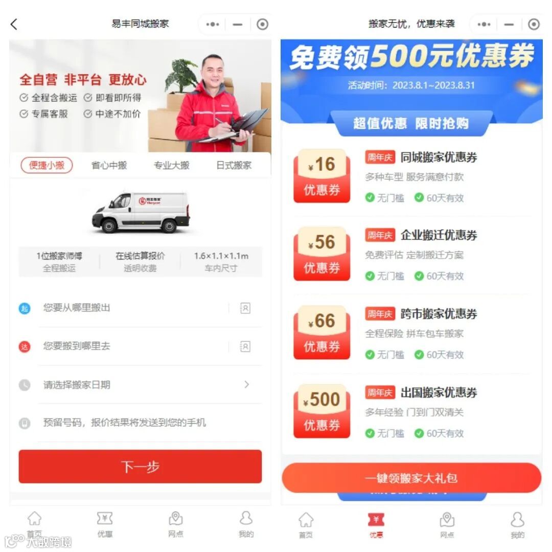 鉴于以上内容,您可以放心选择易丰搬家,通过易丰搬家小程序,输入始发地及目的地,不仅会自动为您生成具体报价,新人还可以免费领取海量优惠券,操作简单,小白也能直接上手。