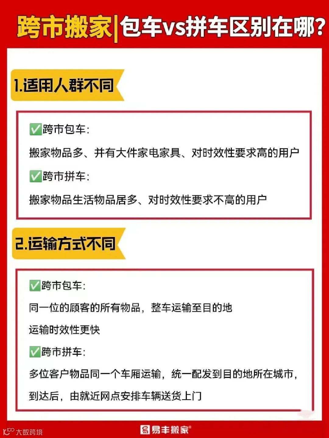 易丰只针对一些特殊大件,比如钢琴、大型鱼缸等收取额外的费用。比如您需要搬家带钢琴,两地均为电梯需要额外收取300元,一边楼梯加收400元。跨市拼车不支持运输钢琴哦!