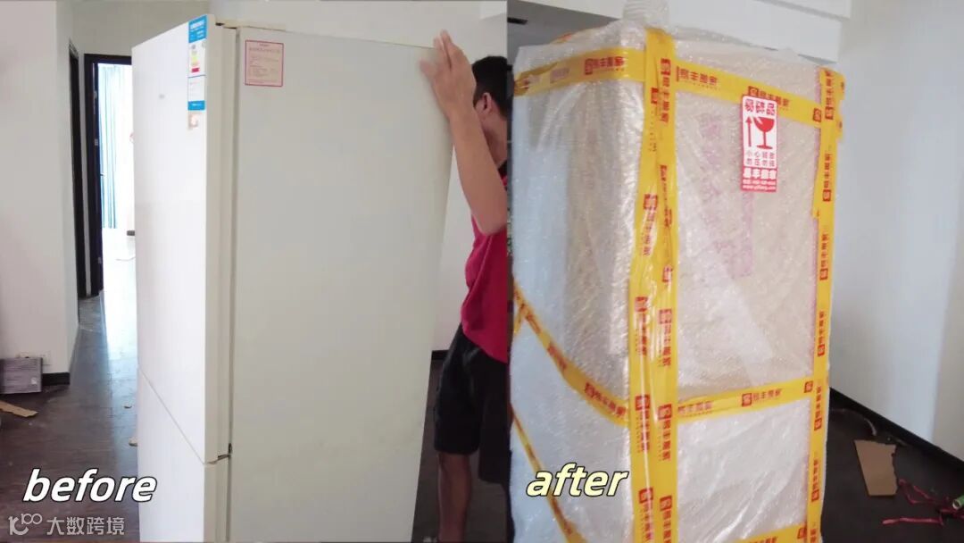 冰箱使用气泡膜多层防护后,在重要部位裁剪合适的纸板二次包裹,最后使用缠绕膜固定并贴上易碎标签。