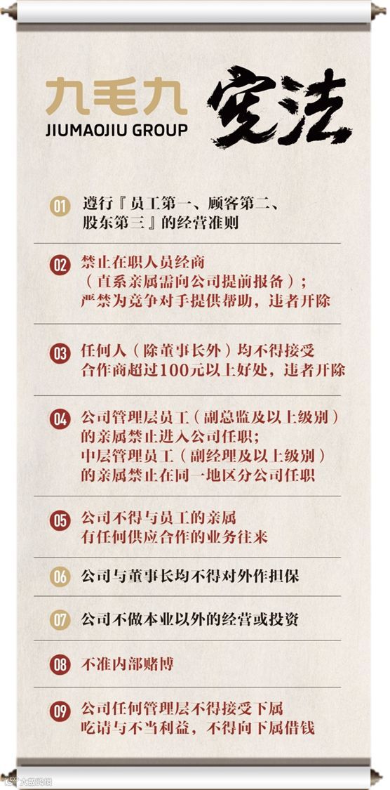 集团宪法第4条明确指出,“公司管理层员工(副总监及以上级别)的亲属禁止进入公司任职;中层管理员工(副经理及以上级别)的亲属禁止在同一地区分公司任职。”