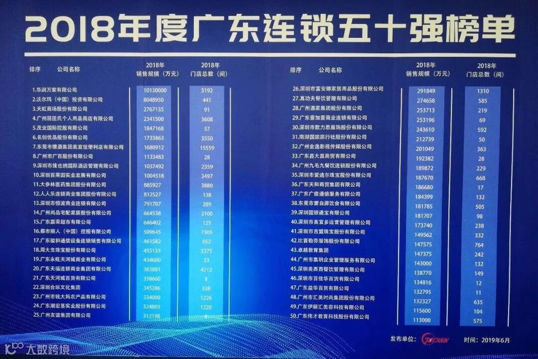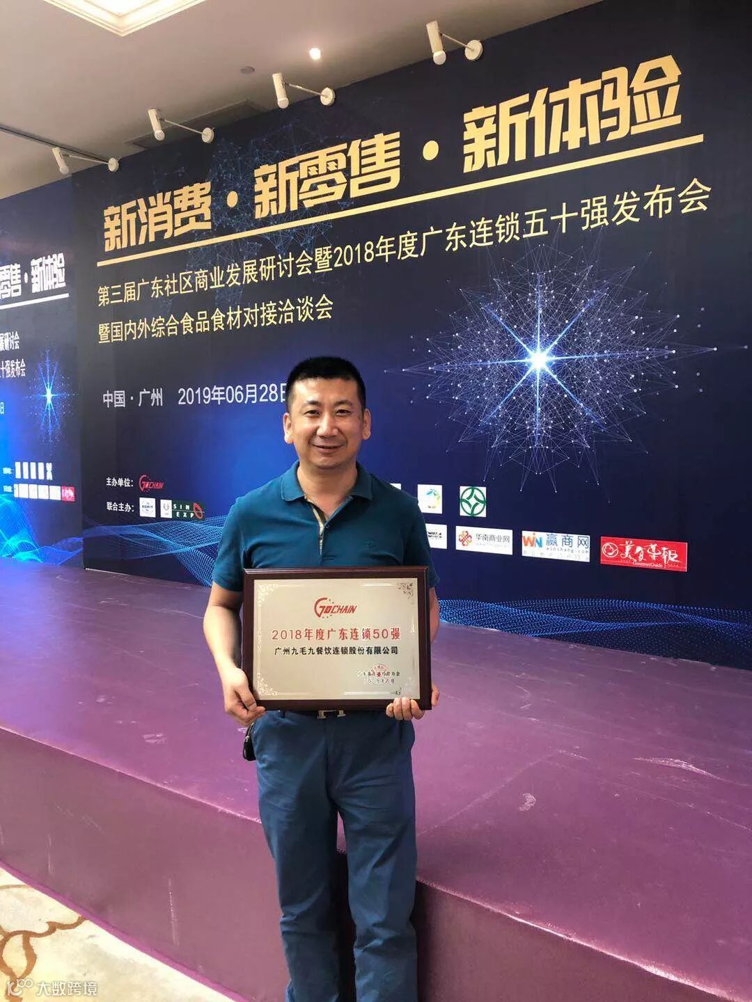 2018年度广东连锁五十强排行榜单排名主要以企业2018年度全年销售规模为统计数据依据或者是上市公司年报公示数据等。根据当日活动榜单显示,九毛九集团时隔一年,以第34名的成绩再次荣登五十强榜单。