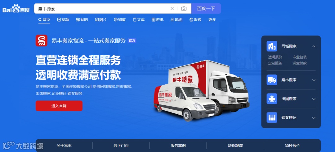 很多搬家公司都有自己的官方网站,比如说咱们搜索“易丰搬家”,就会直接搜索到网址为https://pinzhuan.yifeng.com/的易丰搬家官网。仔细观察的话,会发现官方网站上不仅有蓝色的“官方”字样,和易丰搬家的电话号码:400-100-6666,还会有在线咨询渠道,可以直接跟客服沟通搬家情况。