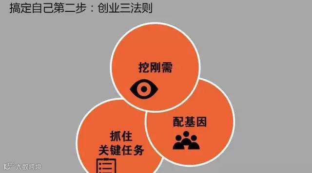 2014年,我明确了还是要做CEO创业,因此,搞定自己的第二步就来了,怎样创业才能不在一开始就注定失败?我经过取经和反思,还做了第二个总结,创业三个法则:挖刚需,配基因,抓住关键任务。