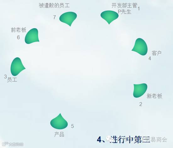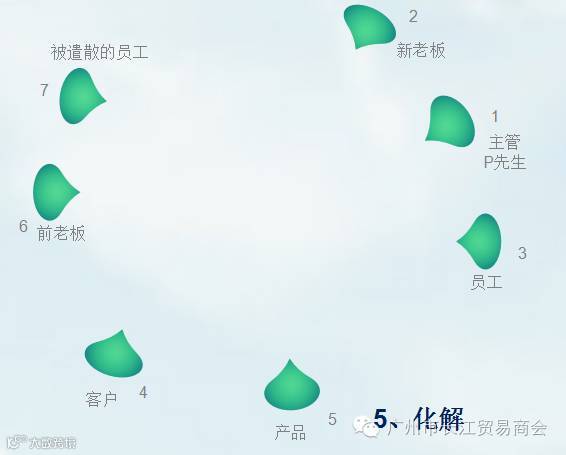 (5)化解:前老板在公司的系统里有适当的位置后,让对这间企业的重要性受到了重视,新老板也开始认同他;以前的员工仍然属于这个系统这点得到肯定,他们付出的辛劳也得到了肯定,于是新员工转向新老板和他齐心协力。客户对公司和对产品产生兴趣了。