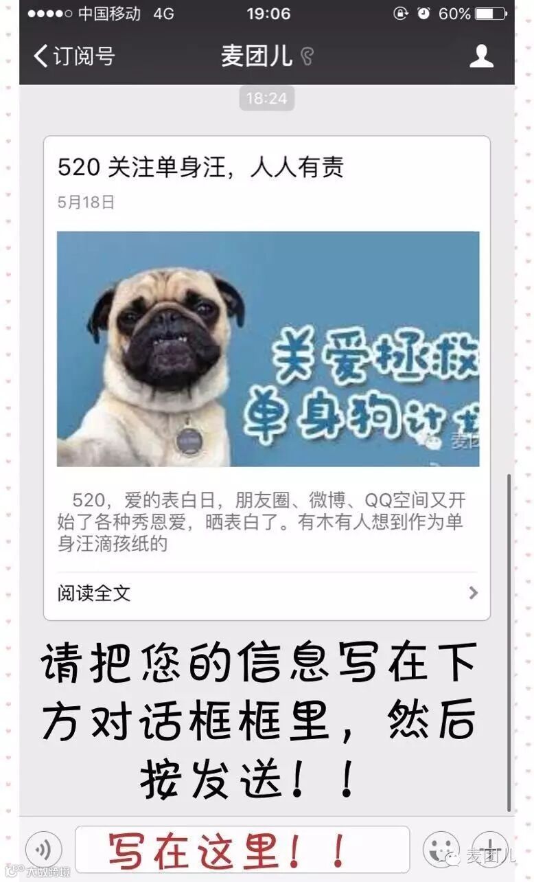 2、参与方式:阅读本微信,将您的信息发给我们的订阅号对话框。信息内容包括:昵称、联系方式、性别、年龄、籍贯、爱好、表白宣言(也就是择偶观)字数在100字以内。