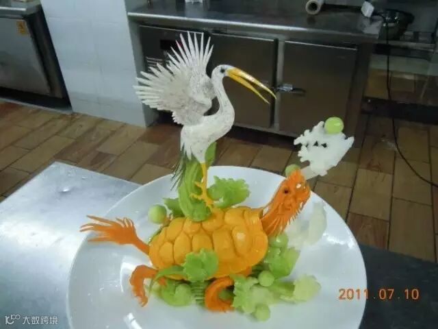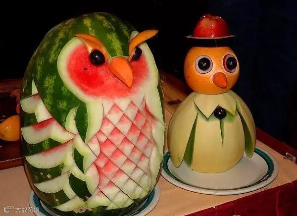 水果是非常常见的食品,通过艺术家的雕刻,变为栩栩如生的各种人物、动物、鸟类、花草和鱼虫等等,令人耳目一新。