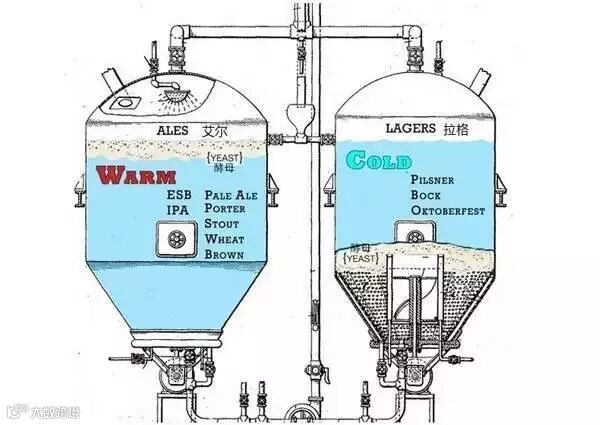工业啤酒:酵母在发酵罐下部工作,沉在酒液的下方,发酵温度一般控制在 10℃ 以下。发酵罐较大,发酵结束会采用过滤和巴氏杀菌,增加啤酒的保质期。