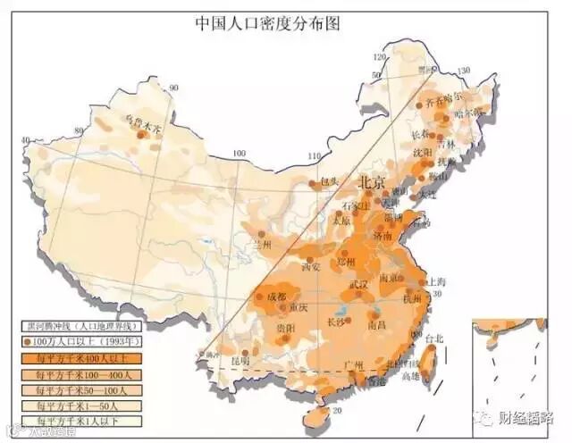 上图就是胡焕庸线,是地理学家胡焕庸在1935年提出的中国东西分界线。在西部,面积超过中国国土的一半,但人口不到5%。东重西轻,是中国人口分布的一大软肋,这种局面需要政策与之博弈。