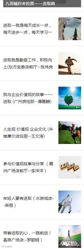 各位亲爱滴小伙伴,今天是“九哥”正能量征文投票的最后一天啦!!“诚信”、“专注”、“进取”、“共赢”四个主题的文章已经全部放送完毕啦!!还没有为您的小伙伴投票的朋友们,争取今天内为您的小伙伴点赞、加油!