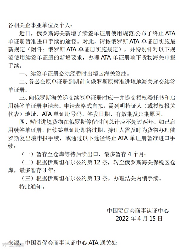 关于俄罗斯海关增加续签单证册使用规范相关事宜的通知