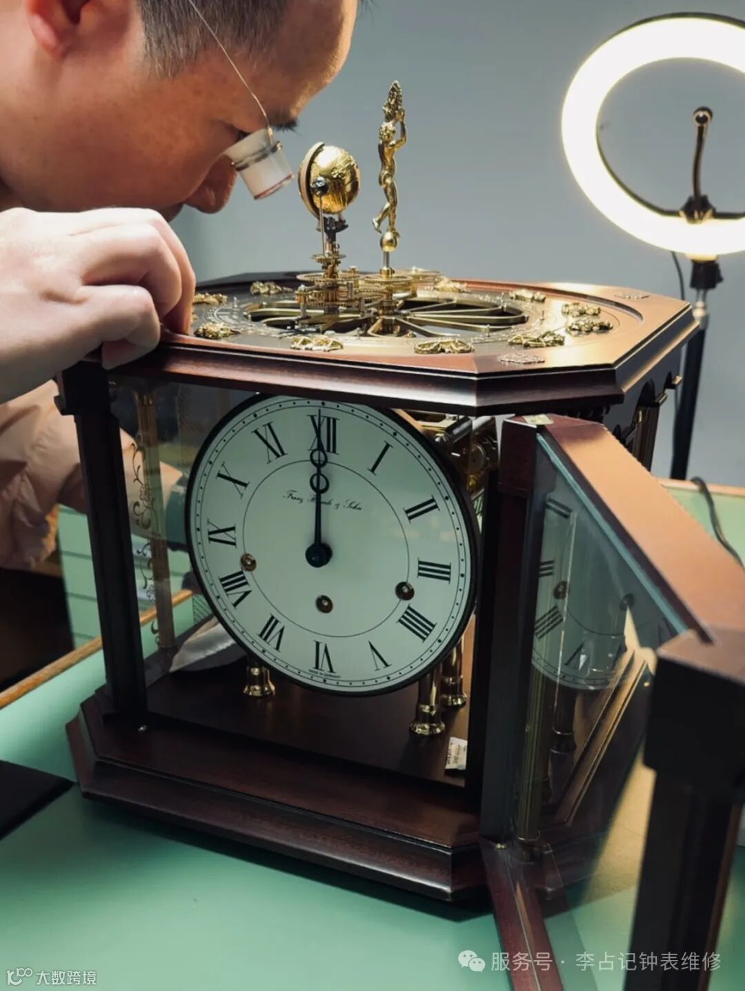 李占记钟表维修团队修复的这款赫姆勒天体钟,需拆解300+零件进行洗油保养。修复难点在于: