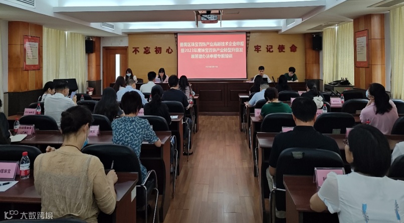 发展,6月14日上午,区贸促委、区科工商信局联合举办番禺区珠宝首饰产业高新技术企业申报专题培训暨2023年度珠宝首饰产业转型升级发展管理办法申报指南宣讲会。20多家有意愿申报高新技术企业的珠宝企业代表参会参训。