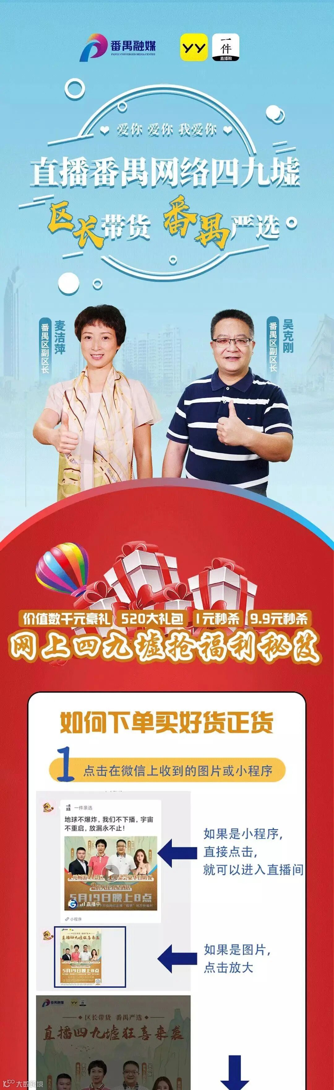 “区长带货 番禺严选”第二场直播活动由副区长麦洁萍、吴克刚担任带货主播,他们将化身“麦子姐姐”和“刚哥”,推介番禺旅游、餐饮、手信、特色农产品。此外,“YY”公司网红主播李先生和戴羽彤也将加盟,与“麦子姐姐”和“刚哥”一起带大家“玩转”番禺。
