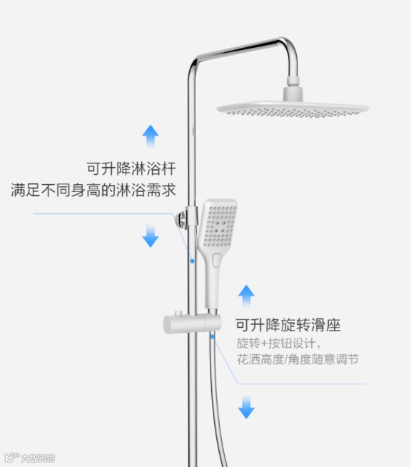 整体花洒双升降设计,轻松升降不卡顿,同时滑座具有360°旋转功能,可带动花洒旋到合适角度,为每个家人找到舒适的沐浴点。