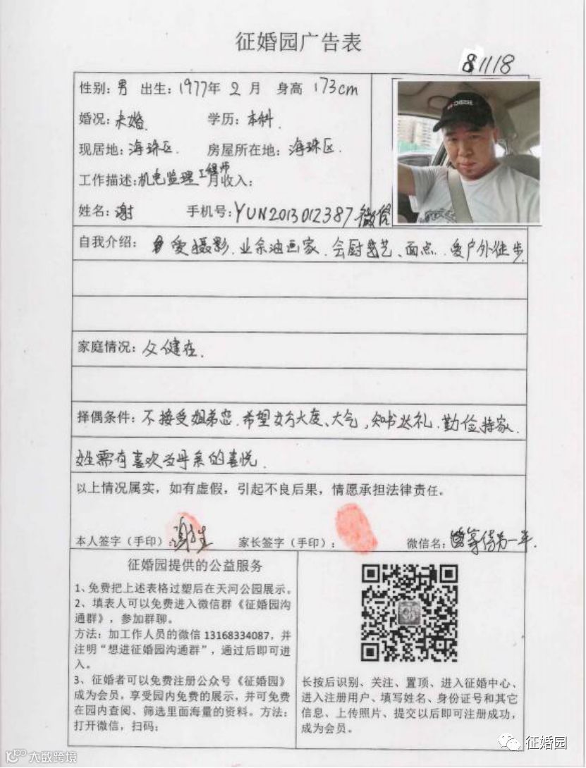 谢某某于2019年8月11日前往广州天河公园相亲角我公司活动点要求参加征婚活动,并填写了《征婚园广告表》一份:
