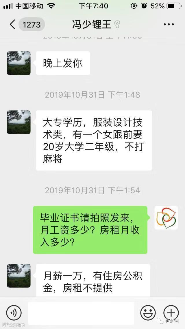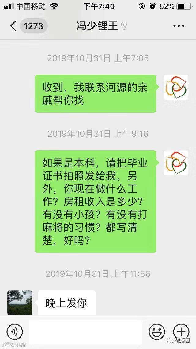 之后,公司工作人员联系河源的亲戚帮他找河源的女生,为了使资料更准确,与冯核实,发现冯没有本科学历,截图如下: