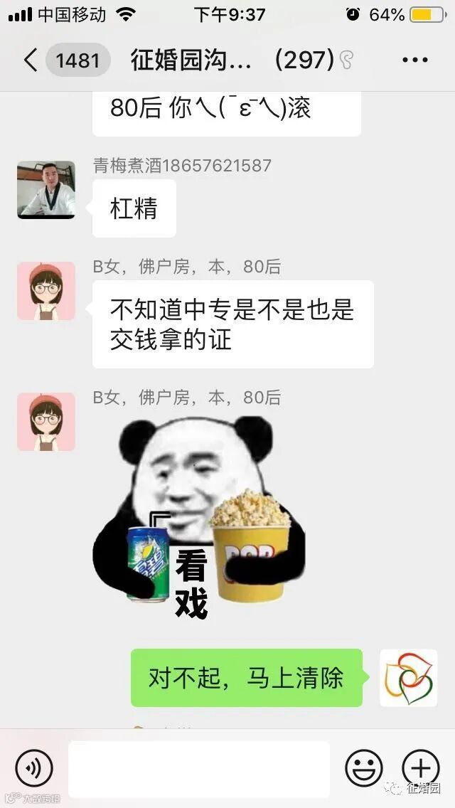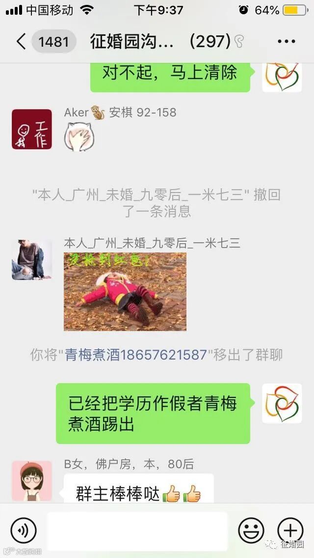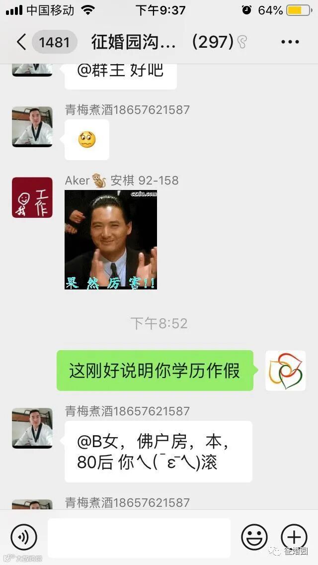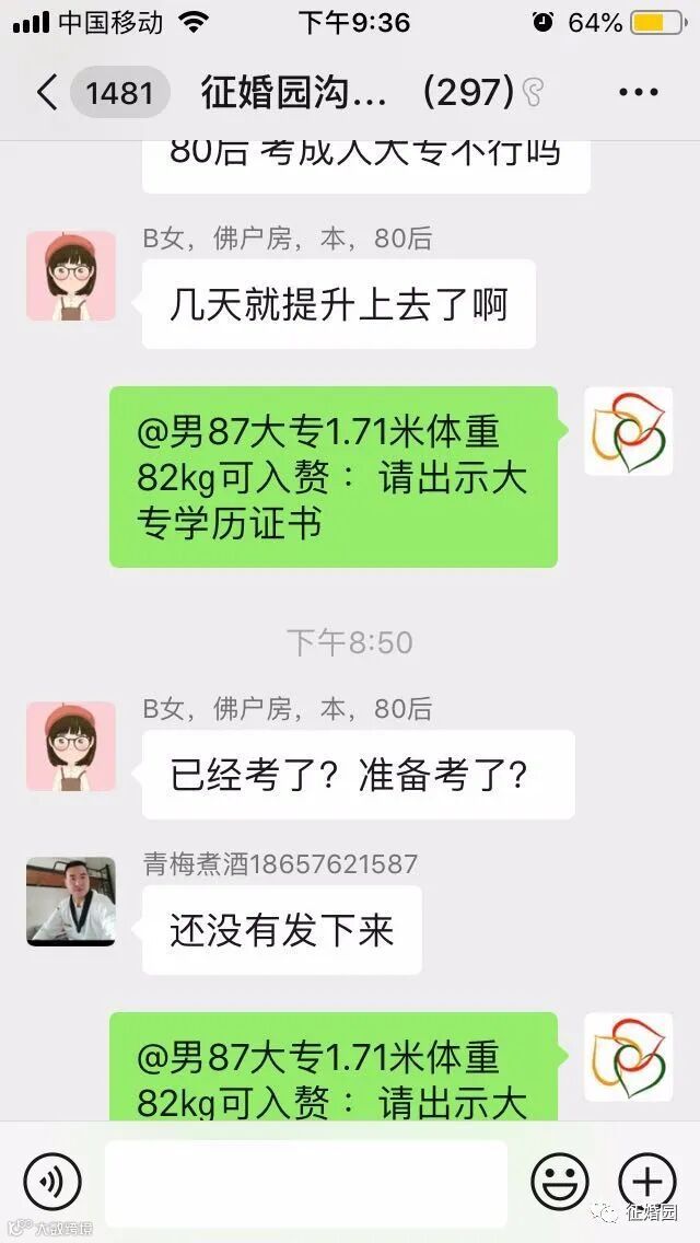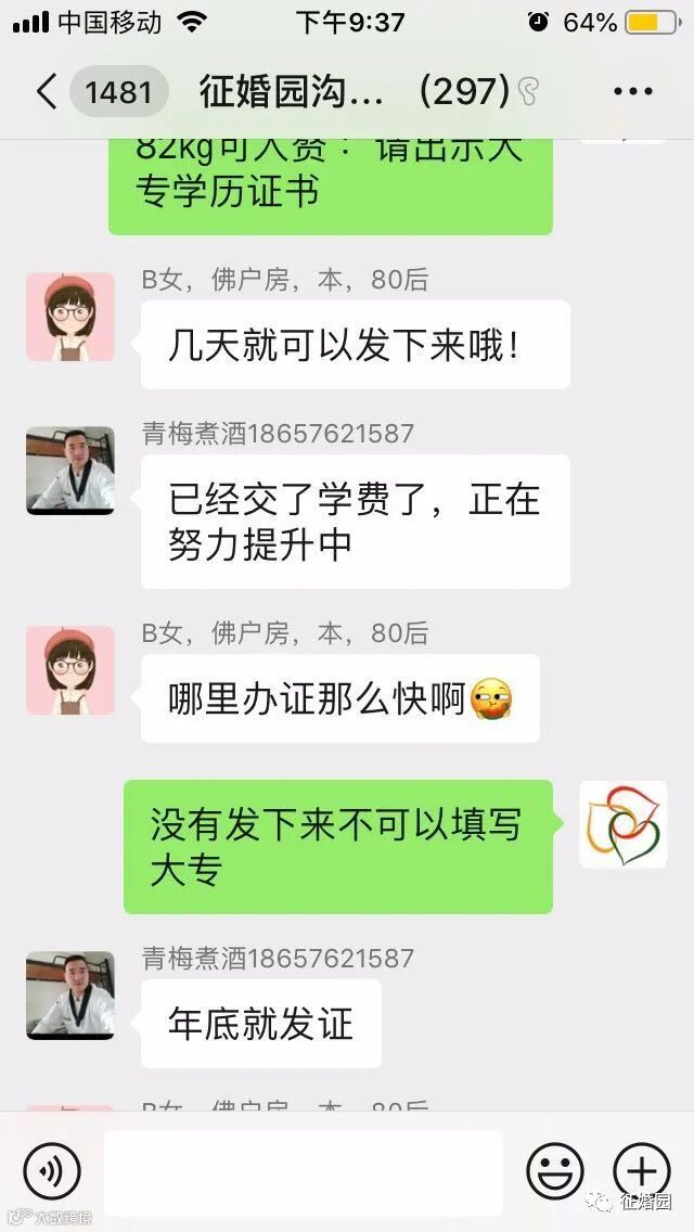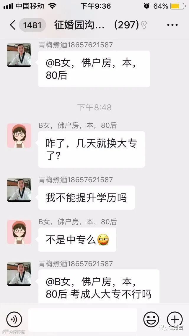 此后的几天内,杨宣要求征婚园工作人员拉他进入“征婚园沟通群”,本身昵称是“青梅煮酒18657621587”,进群后修改了群内昵称,群内昵称里面含有“中专”字样。由于他在群里多次强调学历不代表能力,因此引起了群友“B女,佛户房,本,80后”的注意,特别注意到他的学历是中专。