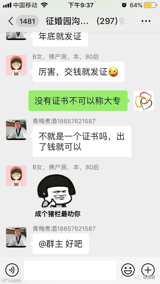 从上述群内对话截图可以看出,群主(头像为三颗心 )要求杨宣出示学历证书,杨宣不但无法出示,反而毫无羞耻地反说学历证书只要花钱就会有,恰恰证明了他根本没有大专证书,还暴露了他习惯于乱报学历,属于习惯性造假者,对征婚市场特别有害,特此公布。