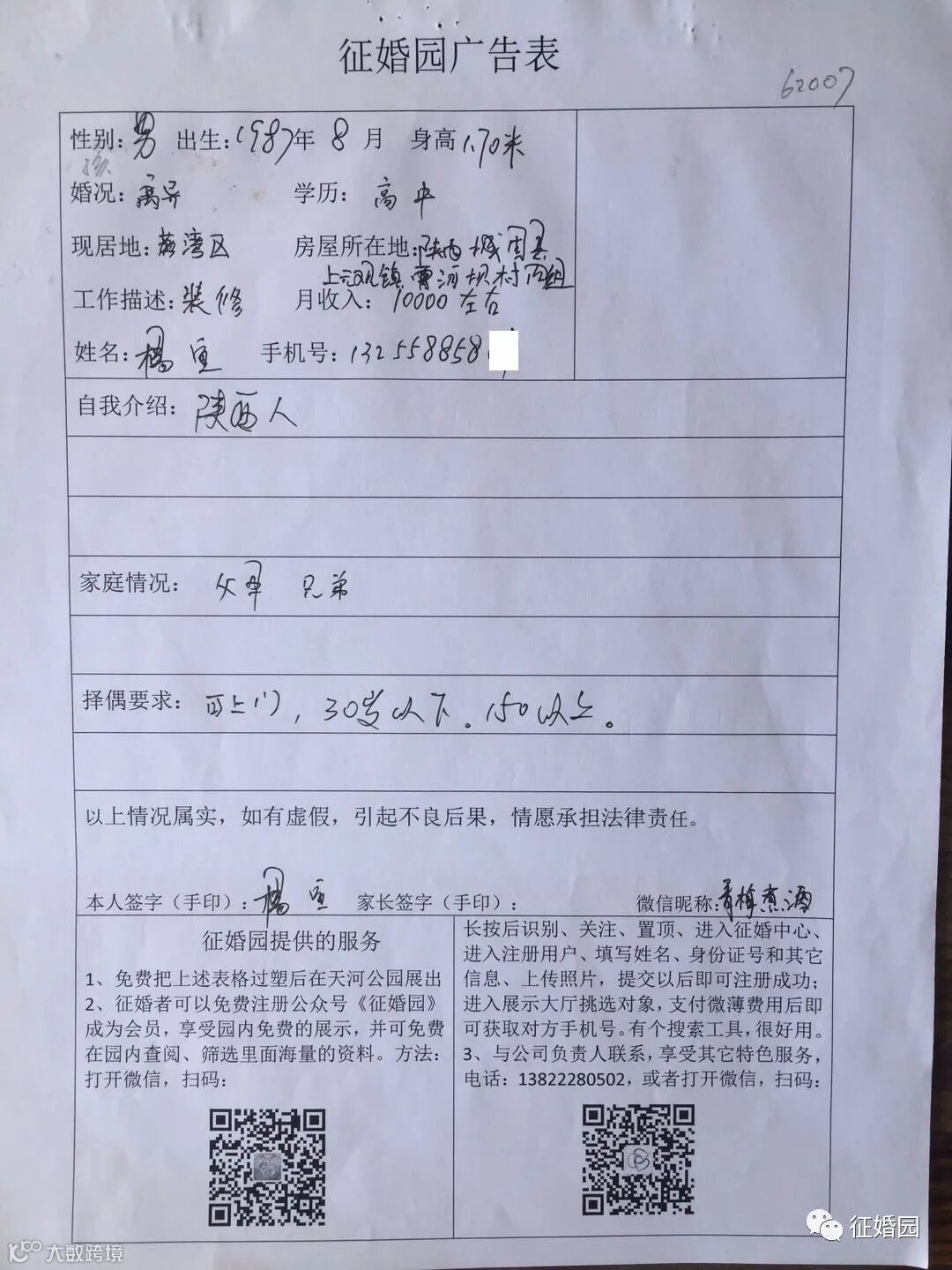 杨宣,男,2020年6月20日在天河公园相亲角登记征婚,他亲自填写的资料如下图: