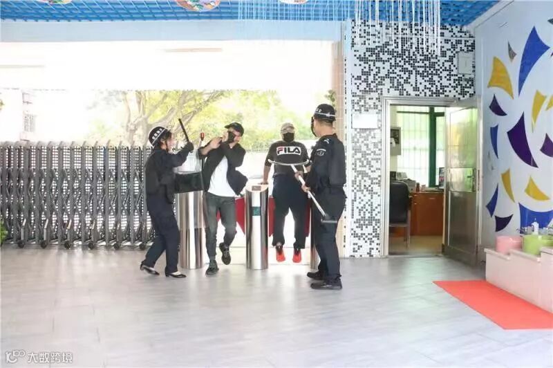 上午10点,幼儿照常进行户外活动,由家长扮演的“歹徒”忽然翻门进入幼儿园。