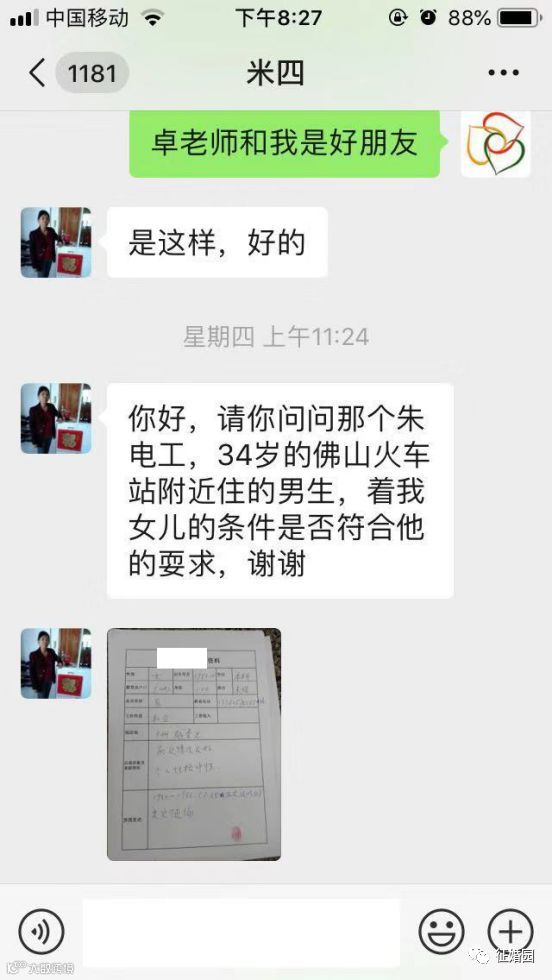 本文的男主人公姓朱,昵称朱电工,手机号137604273**,注册我们征婚园以后进入群聊,这位朋友阅历比较丰富,在群里比较活跃,聊起来比较风趣。女主人公姓周,母亲代他相亲,也是我们公众号的注册粉丝,人称邹姨,昵称米四,手机号133605785**。