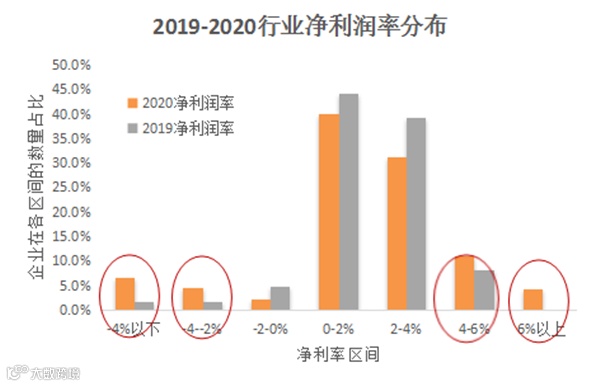样本超市整体毛利率提升,由 2019 年的 17.9% 提升 1.1 个百分点,达 19.0%。因防疫防护、人员加班补贴等刚性支出,净利润率有所下降,从 1.2% 下降到 1.1%。对比 2019 年企业毛利率和净利率分布,两者分化都有所加大。西部企业、销售小于 10 亿的企业平均净利润率下降较为显著。