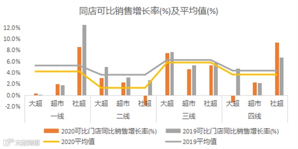 2020 年,超市企业同店可比销售增长整体放缓,平均增长率为 4.1%,增长主要来源于三线城市。大型超市和超市同店可比销售在三线城市表现最好,社区超市在四线城市表现最好。从细分业态维度看,大超和社区超市增长较快,超市增长最慢。