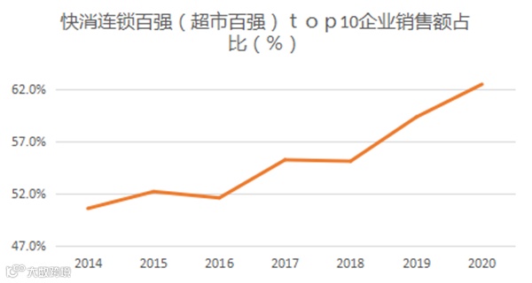 超市百强销售和门店数依然保持正向增长,但增长速度放缓。快消连锁百强(2019 年上榜企业调整为超市企业,榜单名称也改为超市百强)前十名占百强企业销售份额在提升,2020 年达到 62.5%。