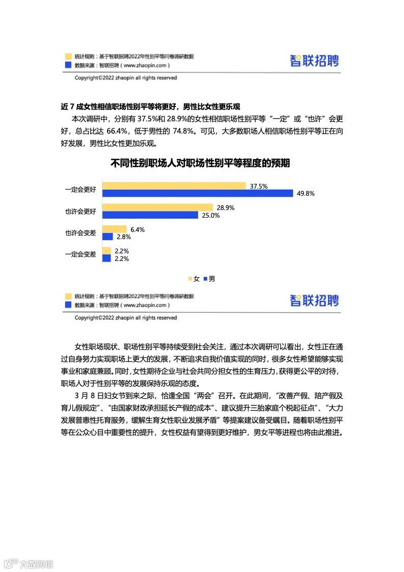 本次调研中,分别有 37.5% 和 28.9% 的女性相信职场性别平等 “一定” 或“也许”会更好,总占比达 66.4%。可见,大多数职场人相信职场性别平等正在向好发展,男性比女性更加乐观。