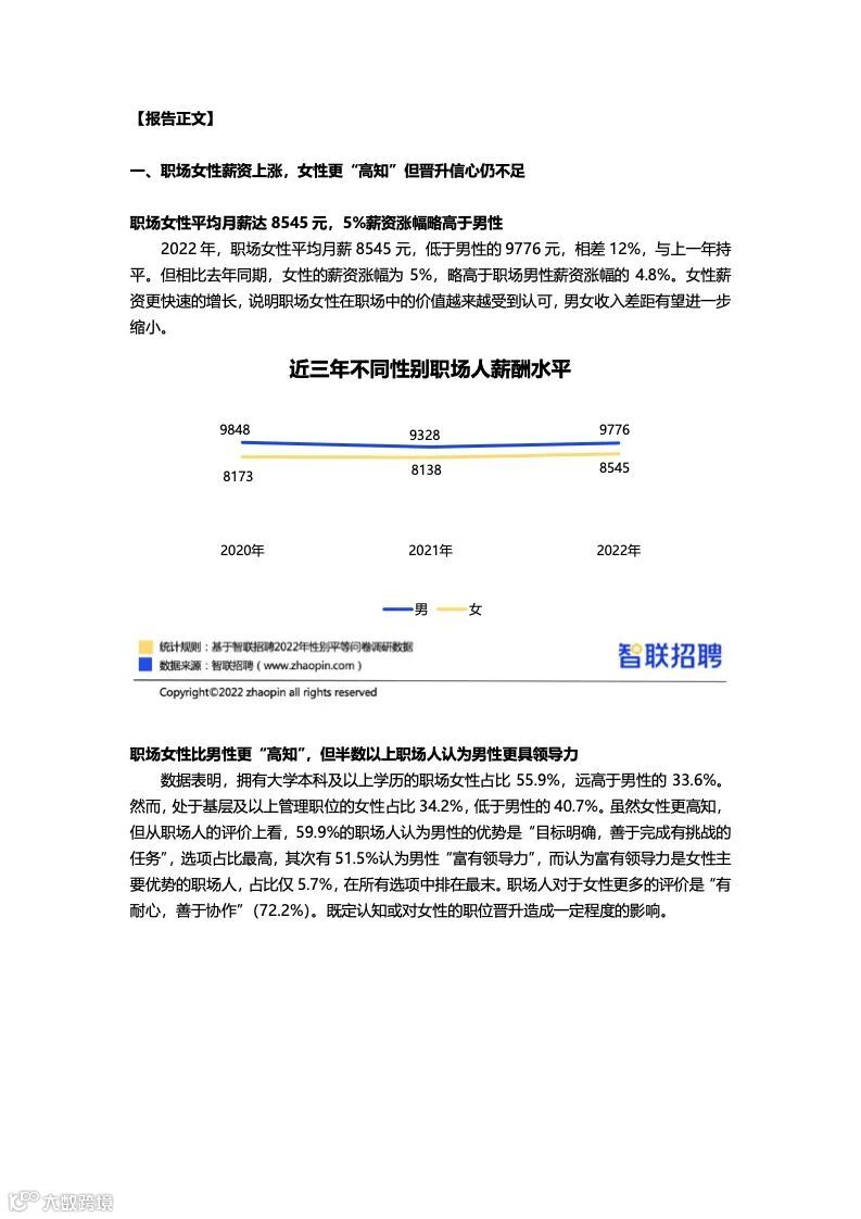 该报告显示,2022 年,职场女性平均月薪 8545 元,低于男性的 9776 元,相差 12%,与上一年持平。但相比去年同期,女性的薪资涨幅为 5%,略高于职场男性薪资涨幅的 4.8%。女性薪资更快速的增长,意味着男女收入差距有望进一步缩小。