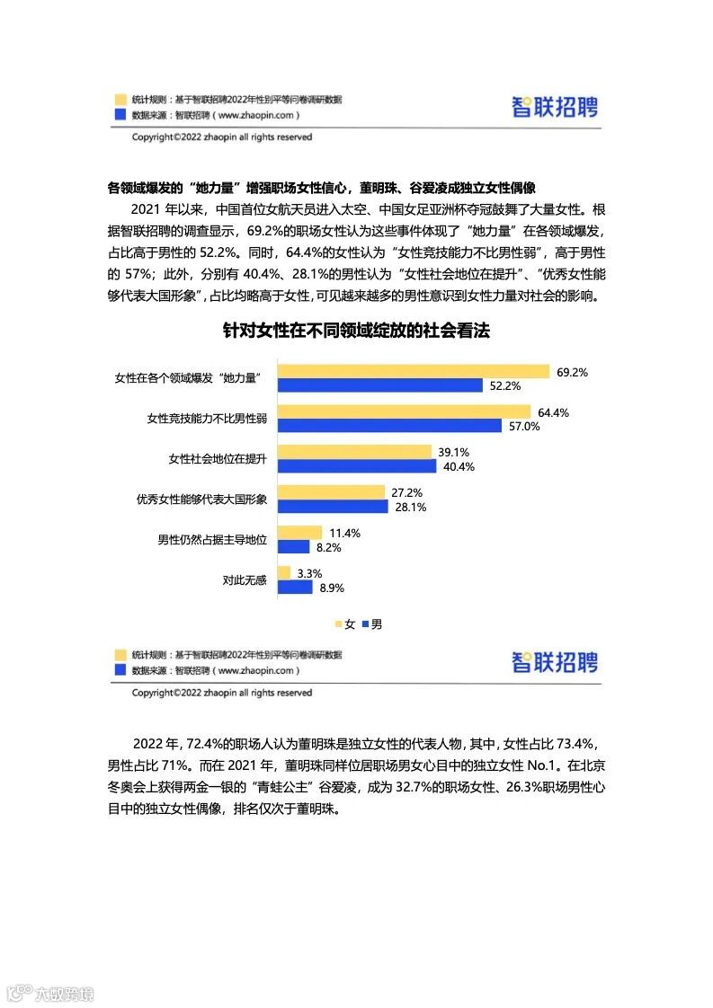 2021 年以来,中国首位女航天员进入太空、中国女足亚洲杯夺冠鼓舞了大量女性。根据智联招聘的调查显示,69.2% 的职场女性认为这些事件体现了 “她力量” 在各领域爆发,占比高于男性的 52.2%。同时,64.4% 的女性认为“女性竞技能力不比男性弱”,高于男性的 57%;此外,分别有 40.4%、28.1% 的男性认为“女性社会地位在提升”、“优秀女性能够代表大国形象”,占比均略高于女性,可见越来越多的男性意识到女性力量对社会的影响。