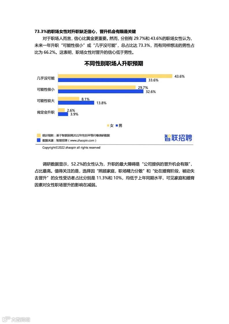对于职场人而言,信心比黄金更重要。然而,分别有 29.7% 和 43.6% 的职场女性认为,未来一年升职 “可能性很小” 或“几乎没可能”,总占比达 73.3%,而有同样想法的男性占比为 66.2%。这表明,职场女性对晋升的信心低于男性。