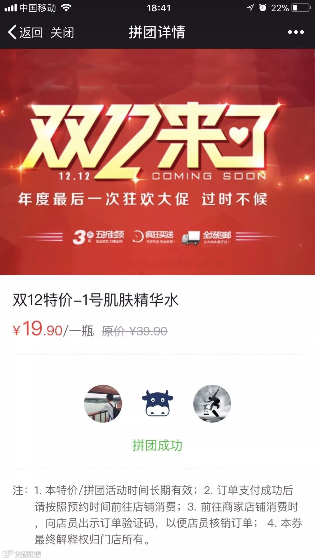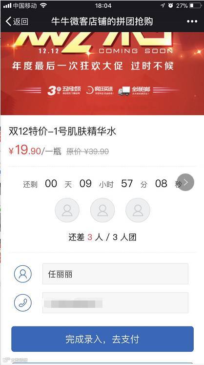 客户点击拼团,可以直接购买。只要在拼团结束前,拼团人数满足,则拼团成功。客户通过“验证码”到店进行服务。