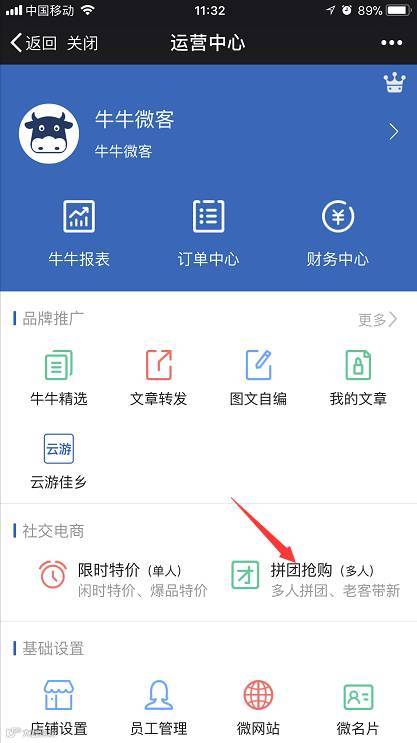 进入运营中心主界面,点击社交电商下的“拼图抢购”,进入拼团抢购页面。