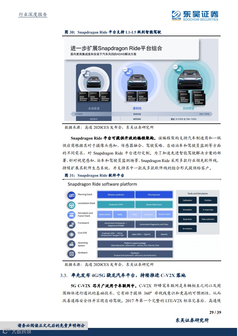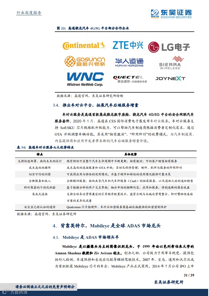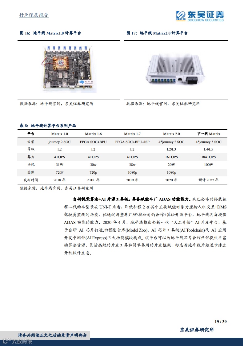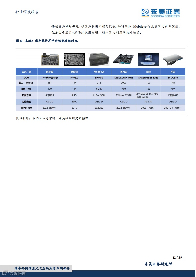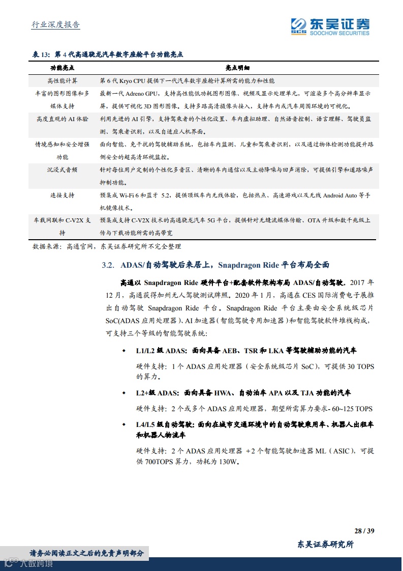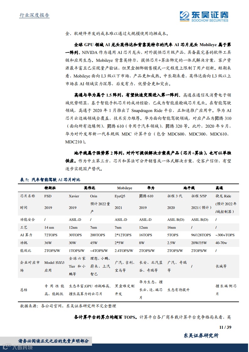 链和应用生态,背靠英特尔的Mobileye客户资源丰富且已量产验证,同属于第一阵列。高通从智能座舱域切向自动驾驶域,快速打通汽车智能化两大关键环节;华为AI芯片云边端领域全覆盖,技术实力雄厚,面向L2+及以上市场。华为和高通均在通信领域具备技术积累,结合智能驾驶布局有望迅速完善汽车智能化生态。地平线对标Mobileye,有望实现国产化替代。