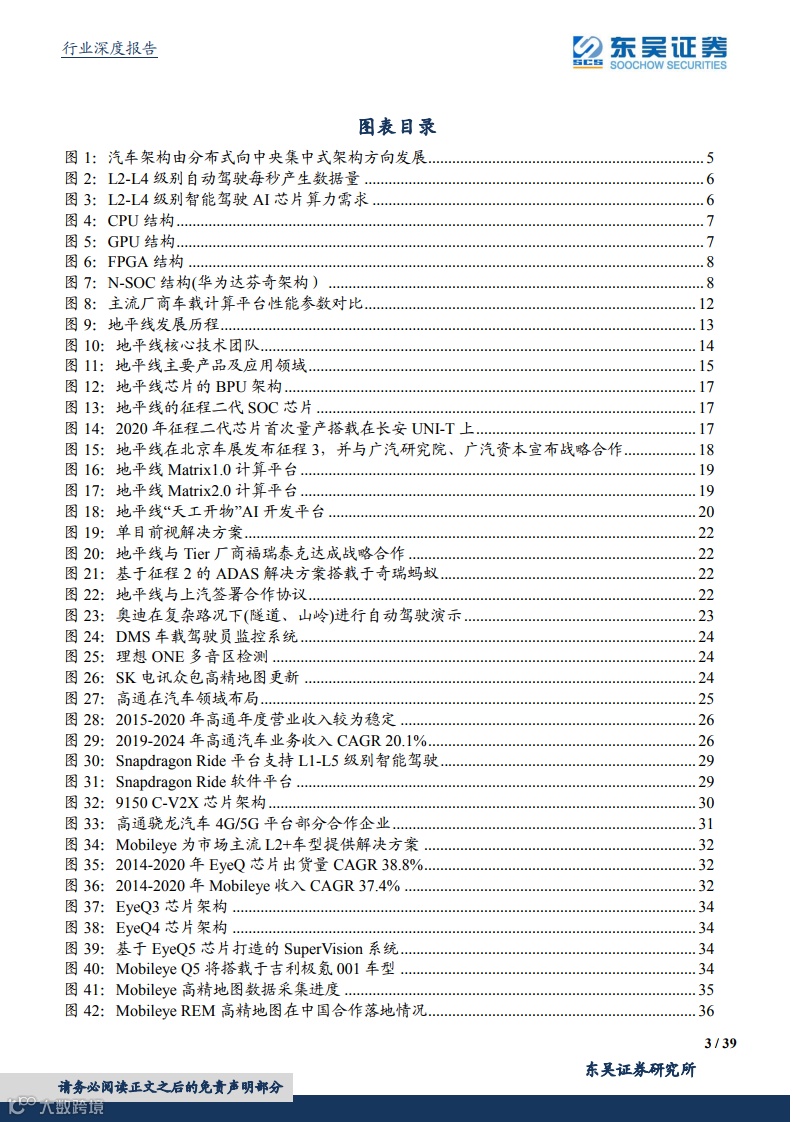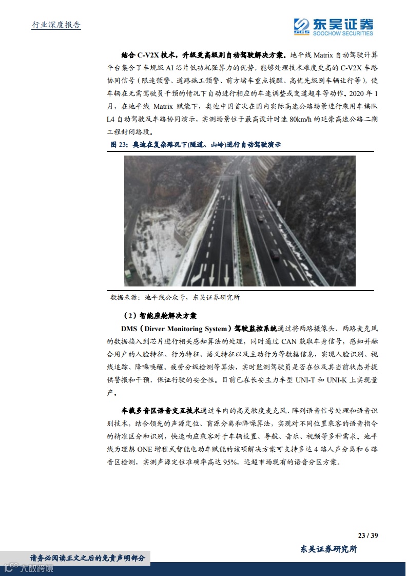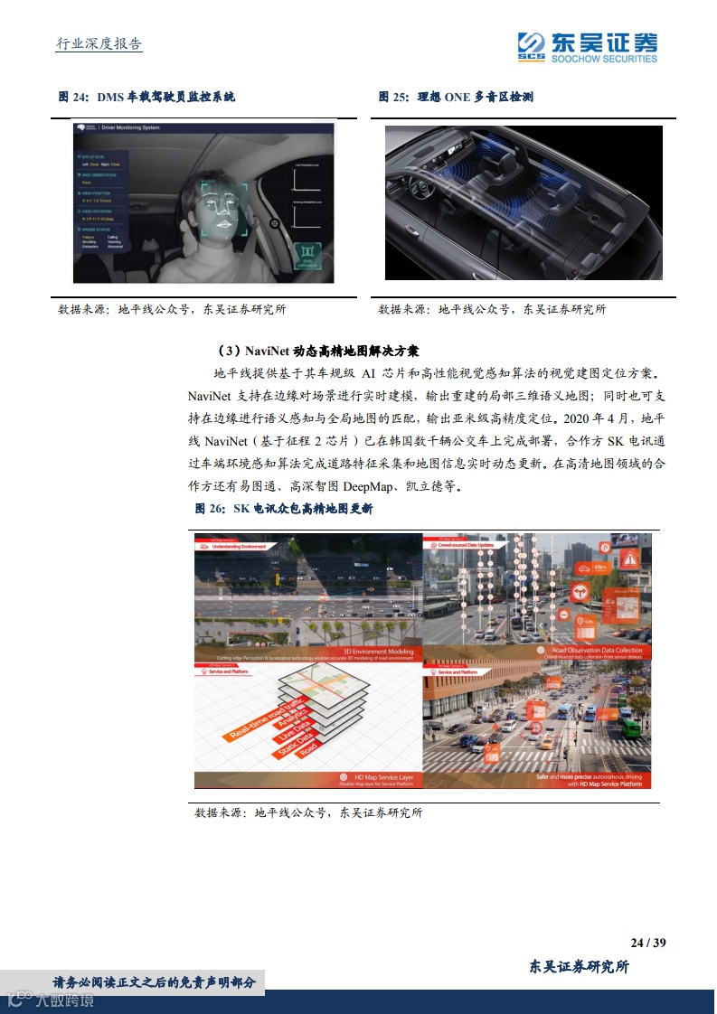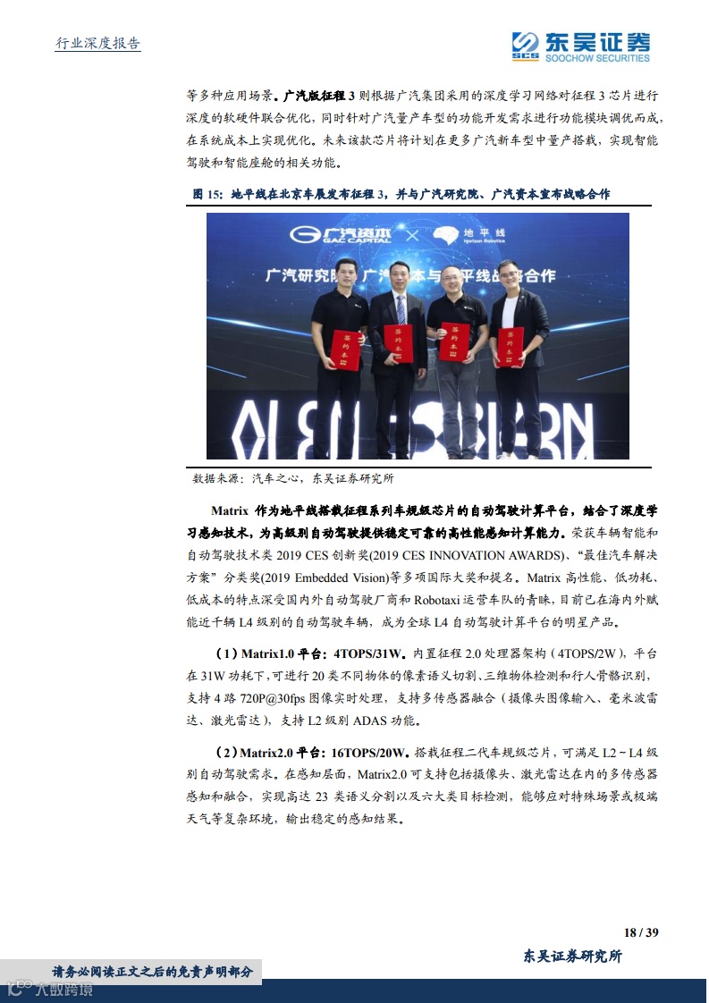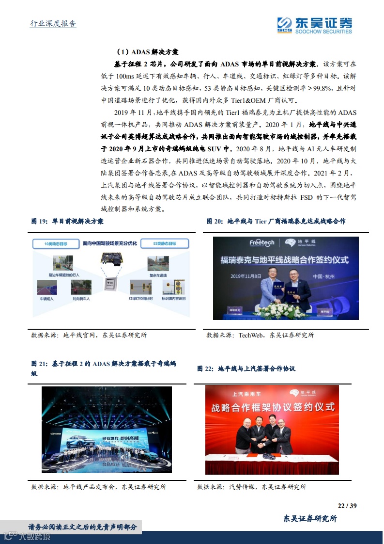 链和应用生态,背靠英特尔的Mobileye客户资源丰富且已量产验证,同属于第一阵列。高通从智能座舱域切向自动驾驶域,快速打通汽车智能化两大关键环节;华为AI芯片云边端领域全覆盖,技术实力雄厚,面向L2+及以上市场。华为和高通均在通信领域具备技术积累,结合智能驾驶布局有望迅速完善汽车智能化生态。地平线对标Mobileye,有望实现国产化替代。