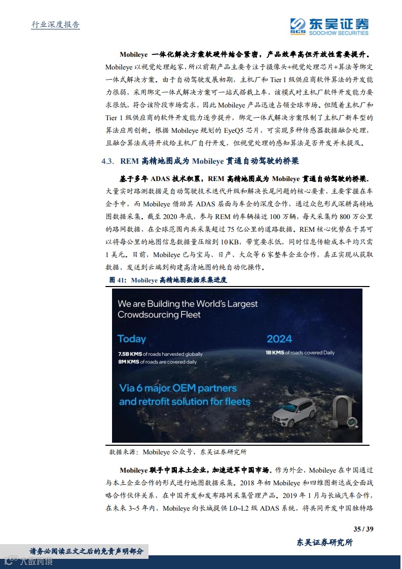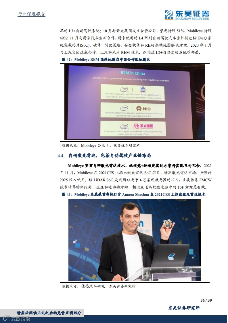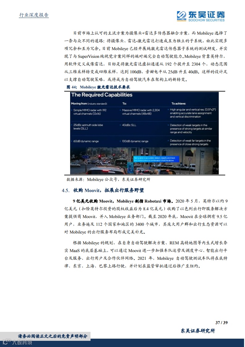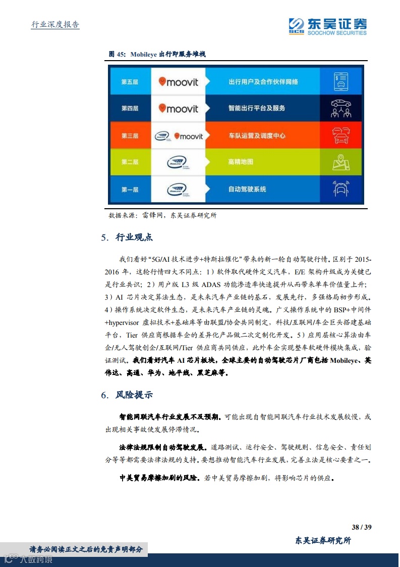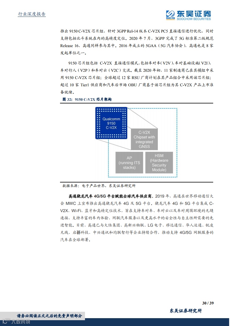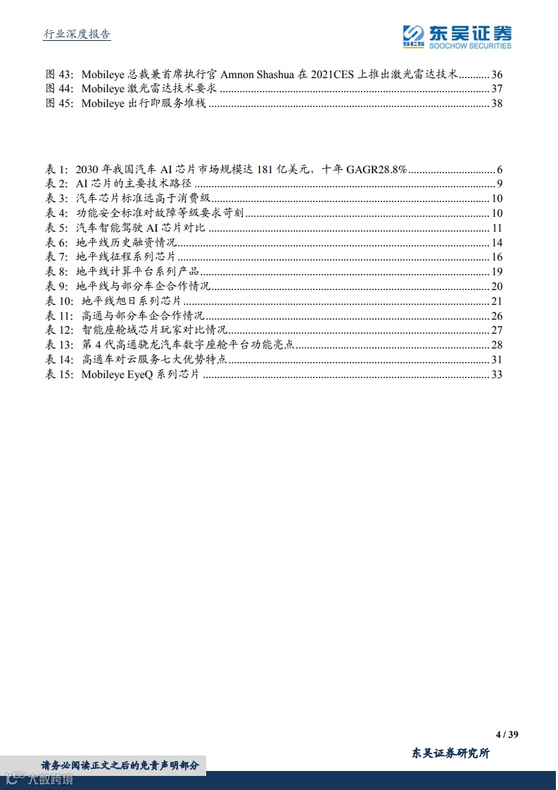 链和应用生态,背靠英特尔的Mobileye客户资源丰富且已量产验证,同属于第一阵列。高通从智能座舱域切向自动驾驶域,快速打通汽车智能化两大关键环节;华为AI芯片云边端领域全覆盖,技术实力雄厚,面向L2+及以上市场。华为和高通均在通信领域具备技术积累,结合智能驾驶布局有望迅速完善汽车智能化生态。地平线对标Mobileye,有望实现国产化替代。