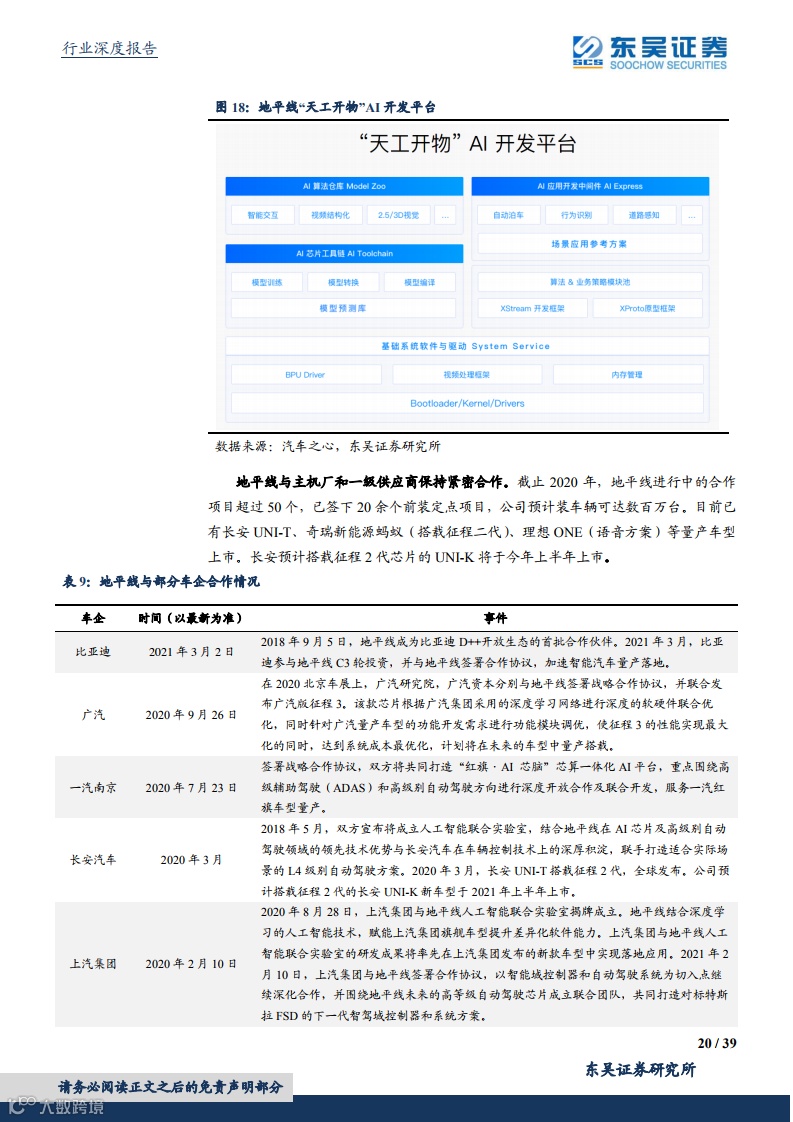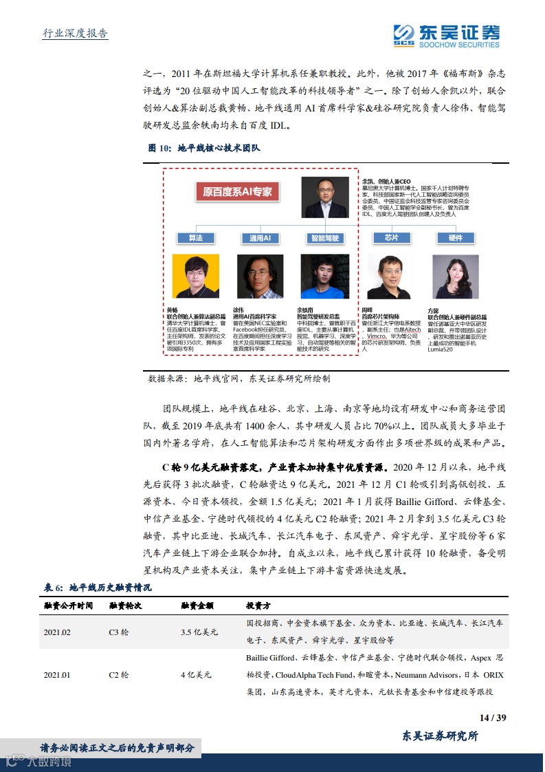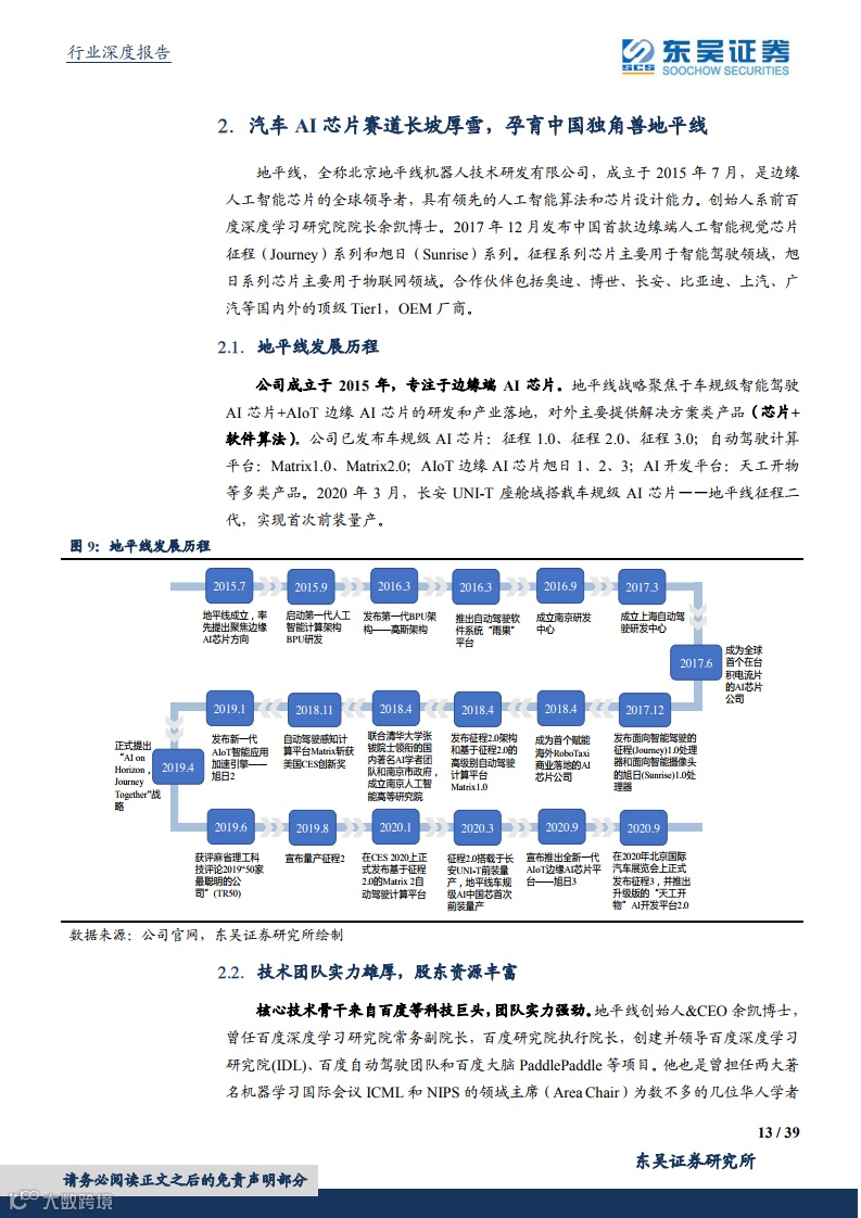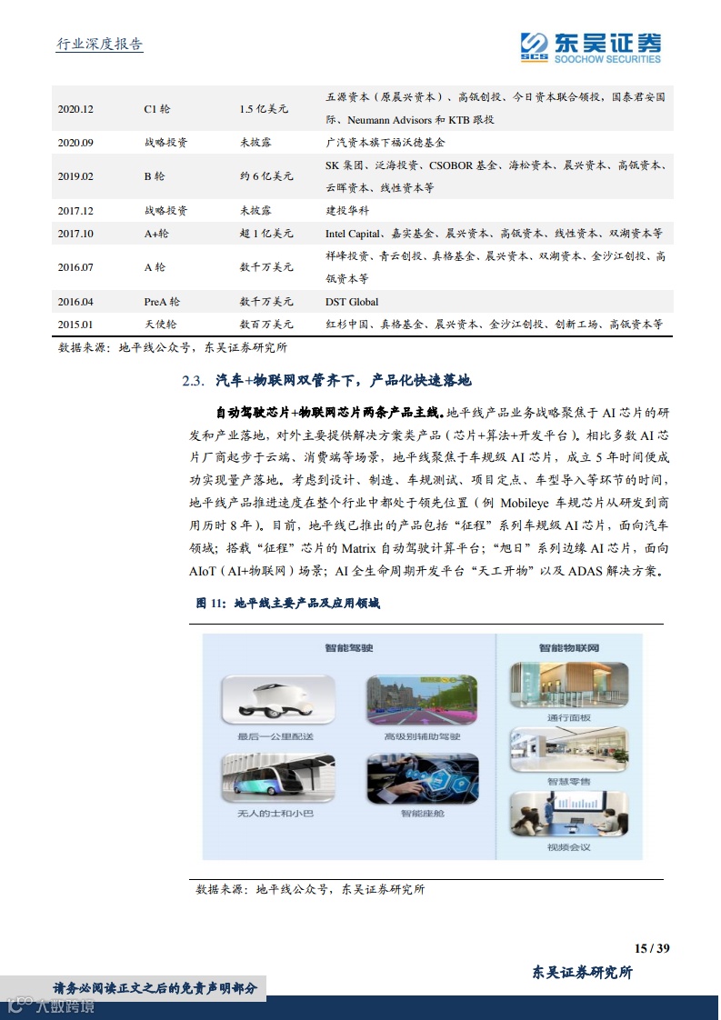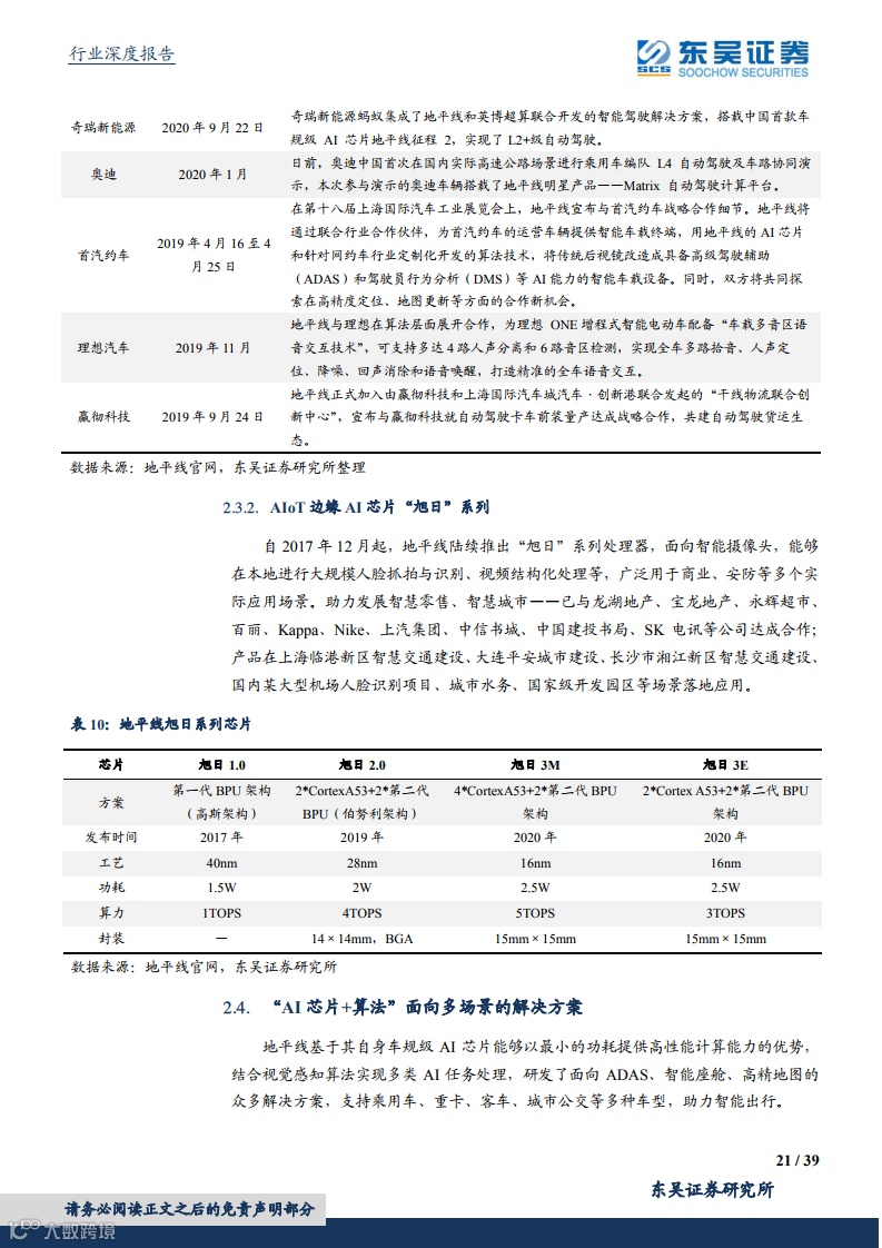 地平线战略聚焦于车规级智能驾驶AI芯片+AIoT边缘AI芯片的研发和产业落地,对外主要提供解决方案类产品(芯片+软件算法)。公司主要优势:1)作为中立第三方,芯片和算法可分开销售或一体式解决方案,受客户信任;2)国产芯片,国内优选;3)技术团队实力雄厚。公司核心技术骨干来自百度等科技巨头。4)产业资源丰富。成立以来累积10轮