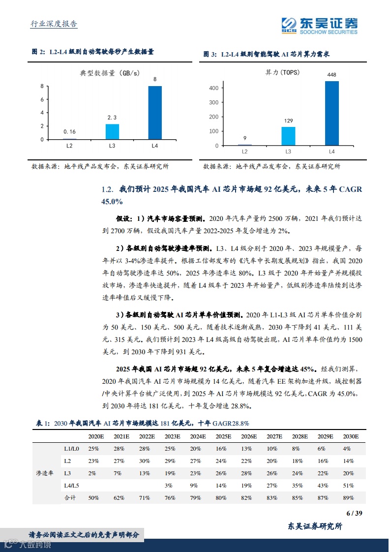 汽车由分布式架构向域控制/中央集中式架构方向发展的过程中,AI芯片作为计算的载体逐渐成为智能汽车时代的核心。集成更多AI单元是智能芯片技术发展大趋势,AI芯片通过添加神经网络单元实现AI运算的更高效。经我们测算,我国汽车AI芯片市场规模由2019年的9亿美元提升到2025年的92亿美元,复合增速45.0%;到2030年将达181亿美元,十年复合增速28.8%。