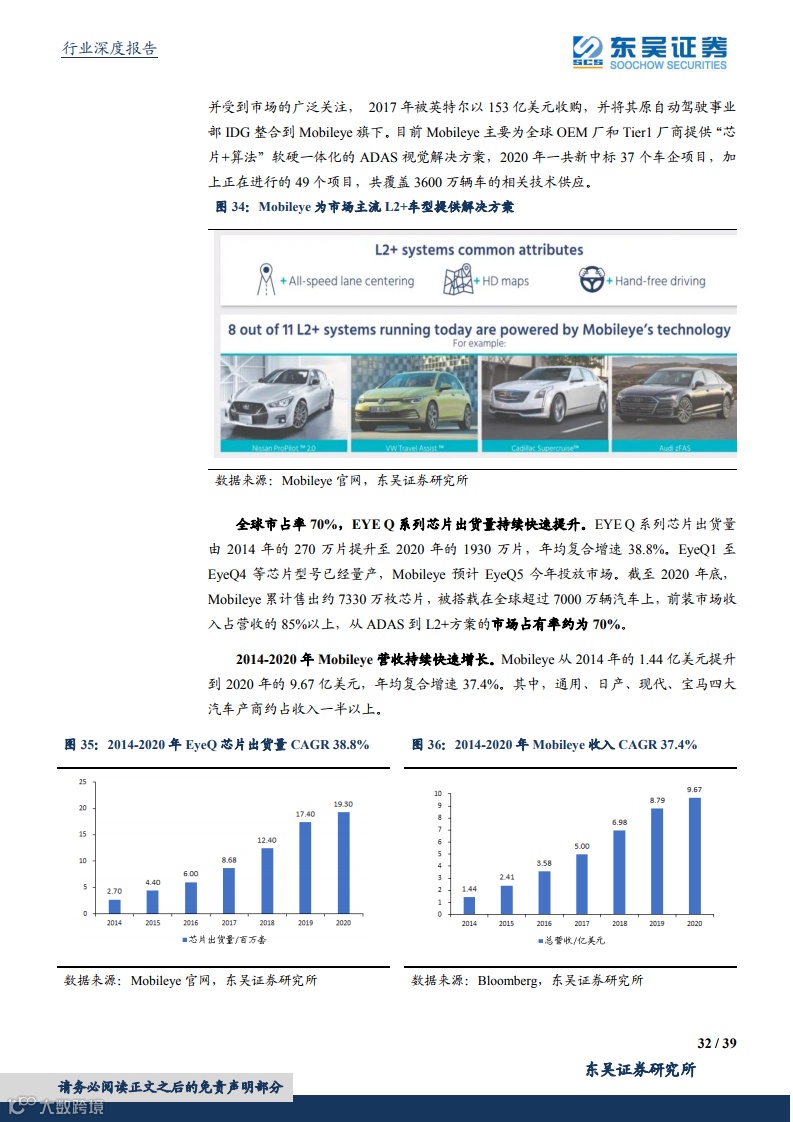截至2020年底,Mobileye累计售出约7330万枚芯片,从ADAS到L2+方案的市场占有率约为70%。EYEQ系列芯片出货量由2014年的270万片提升至2020年的1930万片,CAGR为38.8%。同时,Mobileye营收持续快速增长,2014-2020年总营收CAGR为37.4%。