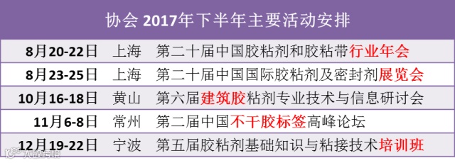 2017年8月21日,中国胶粘剂和胶粘带工业协会成立30周年庆典系列活动在上海龙之梦大酒店隆重举行,来自国内外的胶粘剂和胶粘带行业的相关企业代表800多人参加了本次庆典。