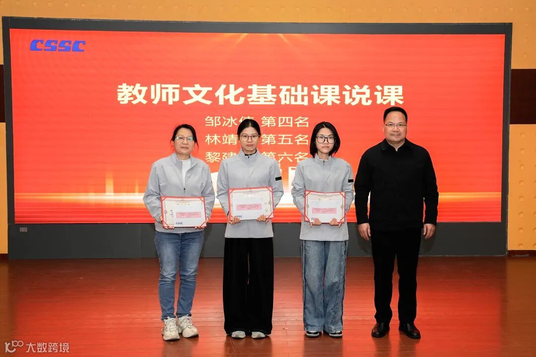 经过激烈的角逐,在教师文化基础课说课比赛项目中,广船技校罗小容凭借出色表现荣获第一名,黄船技校邱嘉慧、广船技校杨爱国分别位列第二、三名。黄船技校邹冰倩、广船技校林靖华、黄船技校黎建清分获第四至第六名。