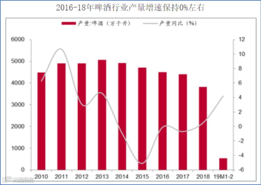 自改革开放以来,中国的啤酒市场一直不断发展。啤酒行业在我国产业化发展之初,属于可选消费品,随着人均收入和经济水平的提升人均消费量会迅速提升,但渗透率和人均消费量达到一定水平后,其经济水平的提升就难以推动人均消费量的继续增长。在2014年,中国啤酒产销量首次出现下滑,2015年大幅下降5.1%,2016-2018年三年增速均在0%-1%左右波动,传统啤酒的市场趋于饱和,未来十年预计会有比较高的概率出现1%左右的缓慢下降情况。