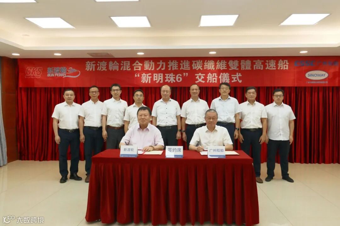 8月8日,中国香港新渡轮500客位混合动力喷水推进碳纤维高速船“新明珠6”号在广州举行交船仪式。香港新渡轮服务有限公司董事长黄烈彰、董事刘用章携夫人刘锦华,广东中威复合材料有限公司董事长张泽铭、副总经理田国新,中国船舶集团广州公司党委书记、董事长区广权,党委副书记、总经理王学军,副总经理宗伟奇、总会计师余彦成、副总经理周庆,中国船舶集团六〇五院副院长姜华参加仪式。该船由广州公司批量承接、广东中威复合材料有限公司建造,是香港地区首艘碳纤维混合动力高速客船。
